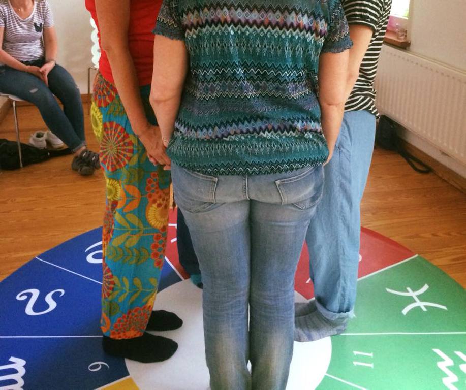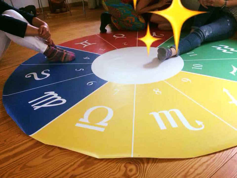 Du kannst zu Beginn Deiner Aufstellung wählen, ob Du für Dich selbst stellst oder Du suchst Dir aus den anderen Teilnehmern einen Stellvertreter der für Dich stellt. Du oder Dein Stellvertreter stellen sich auf einen runden astrologischen Teppich, auf die Stelle der Sonne im Geburtshoroskop. Dann werden weitere Planeten, Symbole, Familienmitglieder, etc. mit Stellvertretern besetzt, die im Leben wichtige Positionen einnehmen. Diese Stellvertreter werden entsprechenden Feldern zugeordnet und dann nachgefragt, was sie fühlen und ob sie zu den anderen Bezug haben. Die Aussagen der einzelnen Stellvertreter sind verblüffend und wenn sie Menschen darstellen sehr realistisch, obwohl der Stellvertreter das Original nicht kennt. Sie betreten ein „wissendes Feld“, das durch sie sichtbar gemacht wird. Während der Aufstellung übernimmt die Intuition die Führung.